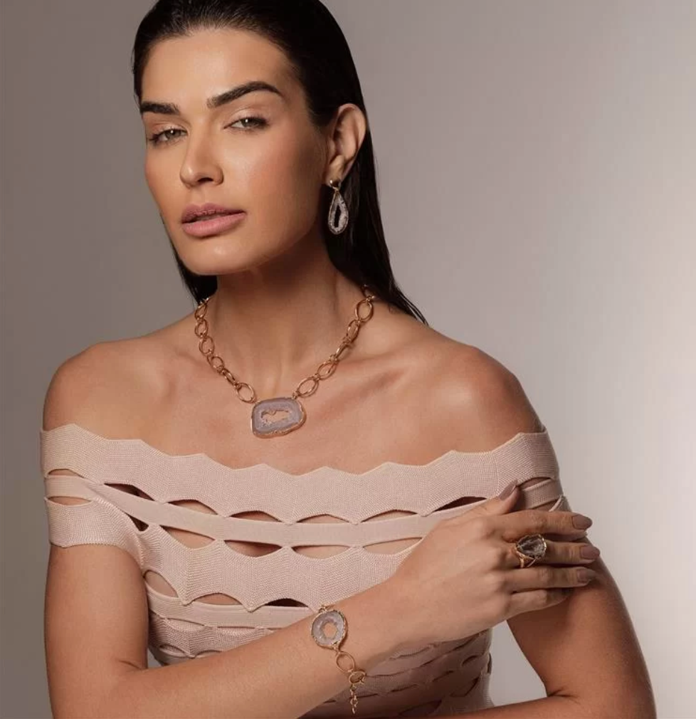 Bracciale con pietra naturale geode, estratta dall'interno di un'agata, con dettagli in druse, di diverse forme e dimensioni, che lo rendono così un pezzo unico. Dispone di 12 cm di maglie più 7 cm di prolunga. Le pietre variano da 2 cm a 3,5 cm.